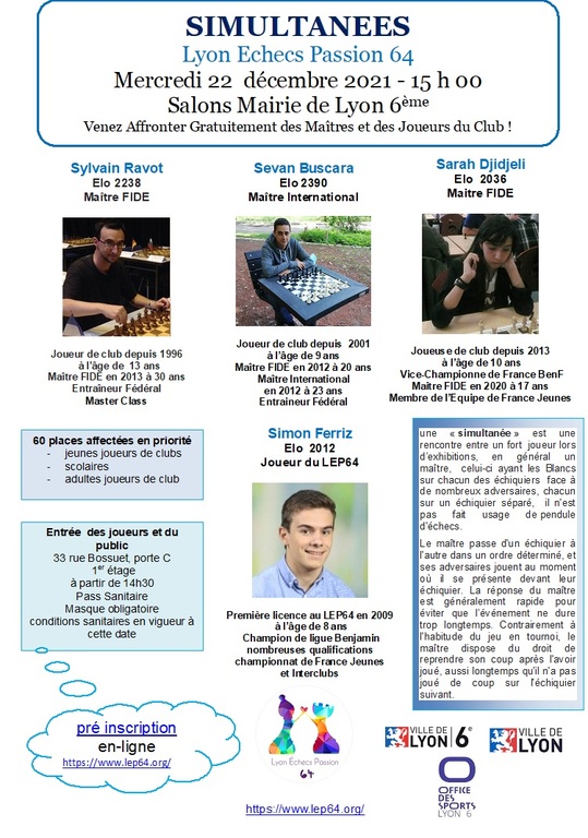 Simultanées organisées par le Lyon Echecs Passion 64 dans les Salons de la Mairie du 6ème arrondissement de Lyon à partir de 15 h 00